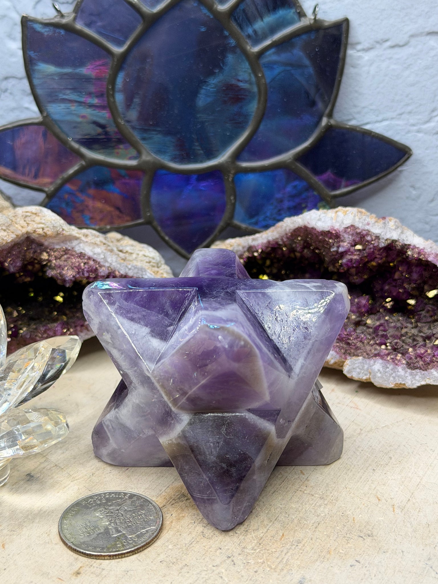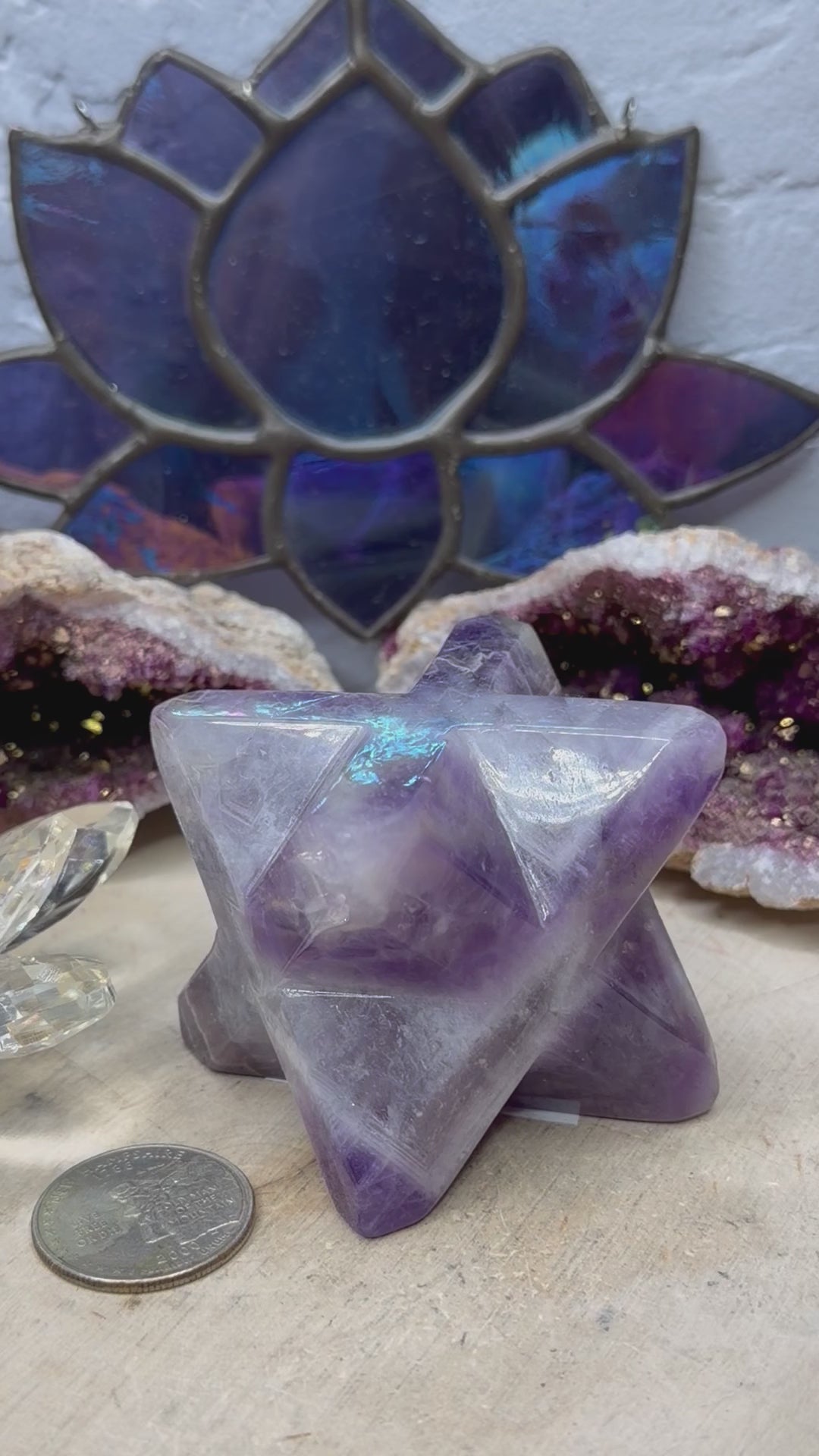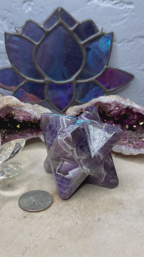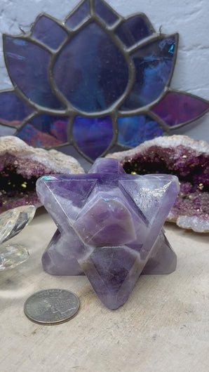 Amethyst helps connect to the divine. It also works with the crown chakra. Chevron Amethyst is also great for dream recall and manifestation. These measure between 1.79x1.84”-2.20x2”. . Check the photos for measurement next to a quarter, which is approximately one inch. The picture shows the quality of the item you will receive. The individual colors and size may vary. The price listed is for one Merkaba.