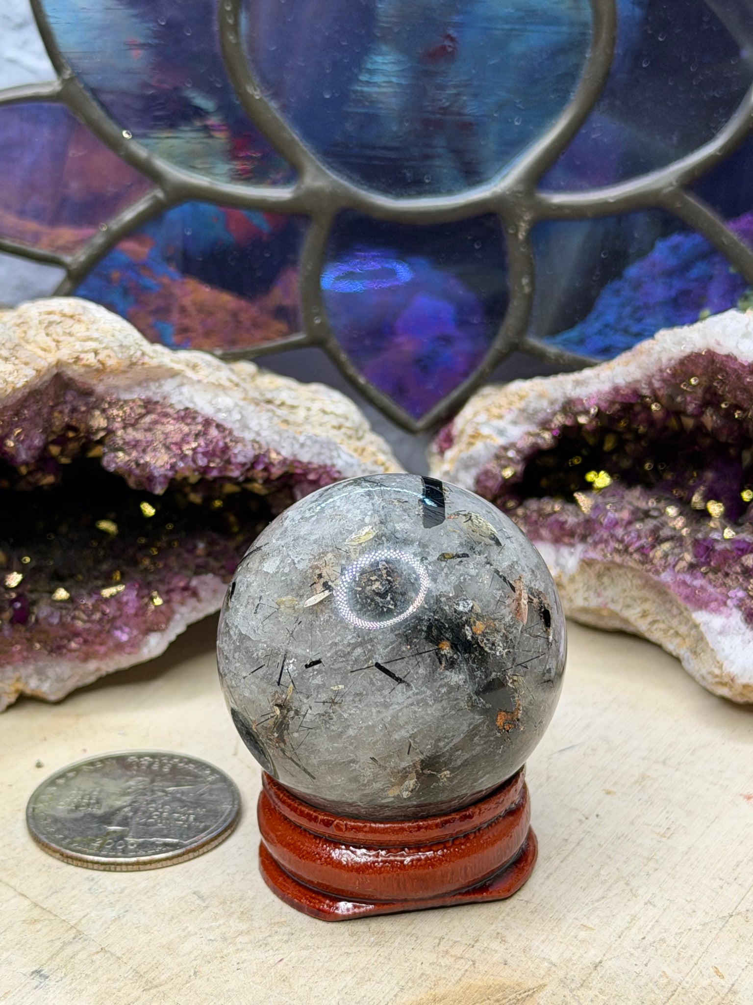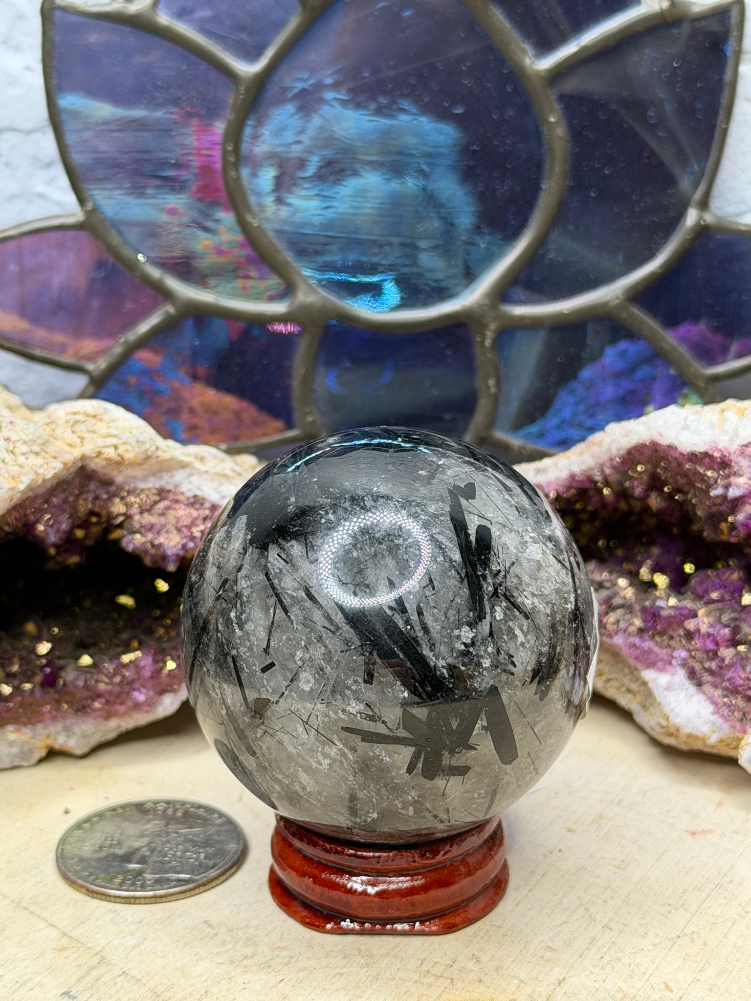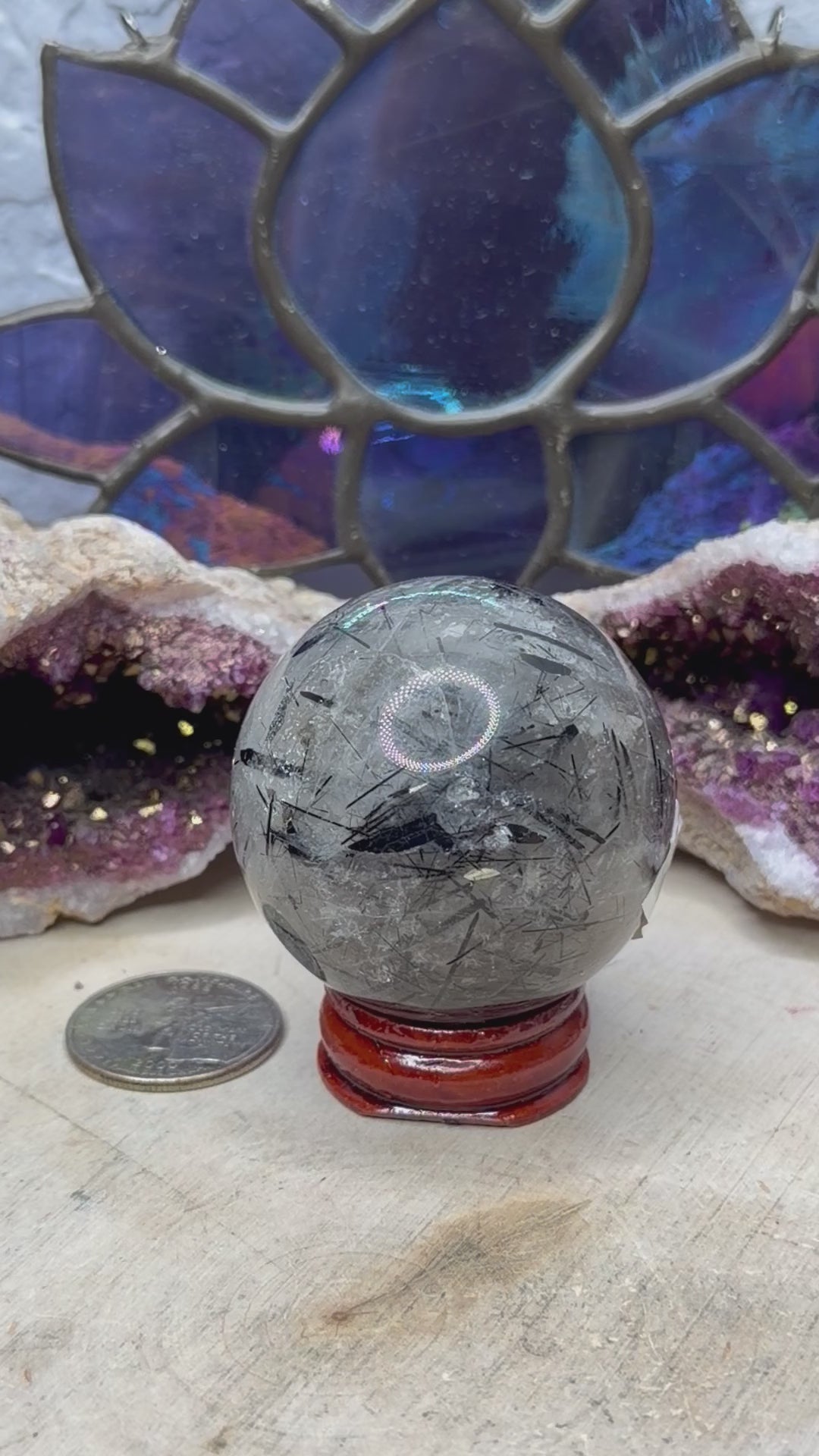 Black tourmaline is a stone of protection and grounding. Quartz amplifies the energy of all surrounding crystals to give this bracelet a boost. Individual size and rutile will vary. Check the measurements next to a quarter, which is approximately one inch. The price listed is for one sphere. Each one comes with a stand. They measure between 36mm-50mm each.